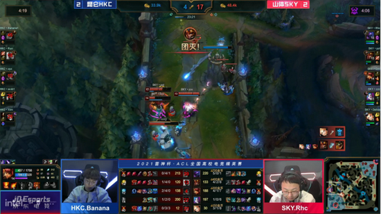 在全国总决赛的舞台上,山体SKY向观众们展现了他们进化成完全体后的精彩团战。在与昆仑HKC战队大比分2:2战平的情况下,山体SKY选择相信自己的实力,拿出了他们的英雄绝活。中单Gzc的法师英雄安妮,在最后决定性的高地团前,肩负起输出使命,借着灵活的技能在峡谷中翻飞起舞,将敌方化作自己的玩具小熊,队友跟上收割战场。Gzc选手的关键性表现让队伍打响了属于山西体育职业学院的赫赫威名!