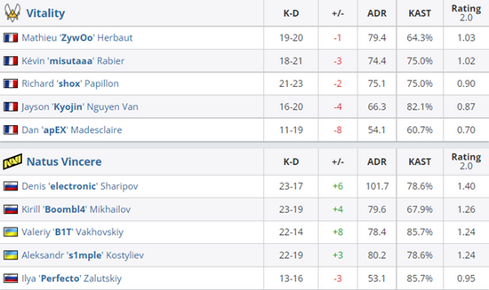 下半场手枪局NAVI五人抢下A大,包点互相厮杀,好胖球拿下残局。刚枪的小蜜蜂前压B洞未能成功,好胖球的灵活走位拿下小蜜蜂的强起局,比分顺势来到13-5。长枪局NAVI清中路首杀apEX,ZywOo枪法失误被NAVI突破,比分14-5。半起的小蜜蜂也没有人站出来,NAVI拿到赛点。NAVI默认后打B,Perfecto秒杀狙击位shox,s1mple大狙补枪迅速,NAVI获胜。