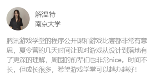 不少学生对此也有不错的反馈,比如“—年前的我们连要用什么软件做游戏,要怎么让一个人物动起来都不知道,有问题都不知道该去哪问”,但腾讯游戏学堂的项目,在他们摸石头过河的道路上指引了方向。
