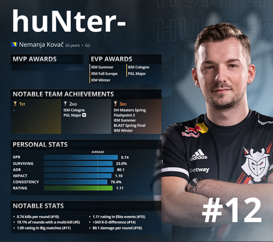 Nemanja “huNter-” Kovač被评选为本年度Top 12,强大的正面火力表现与在各大赛事中所取得的众多荣誉是他上榜的理由。
