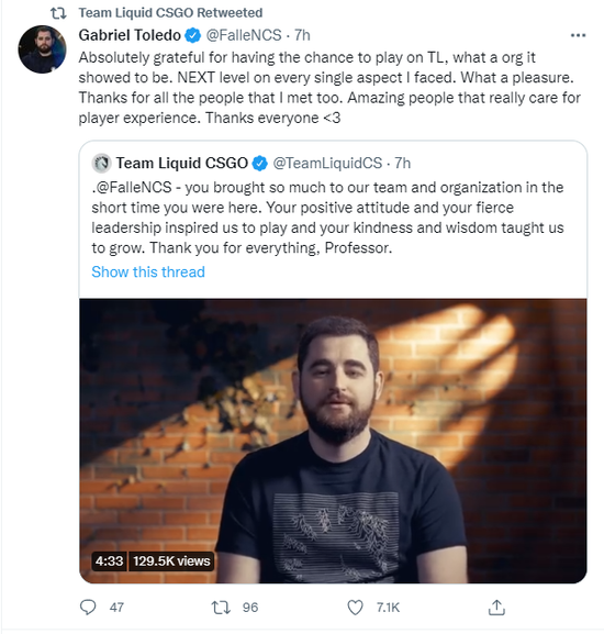 “非常感谢能让我有机会在Liquid效力,这是一个多么优秀的俱乐部。我在这里经历的每个方面都是更高层次的。多么荣幸!我对我遇到的每个人表示感激,他们都很关心选手的体验。谢谢大家!”