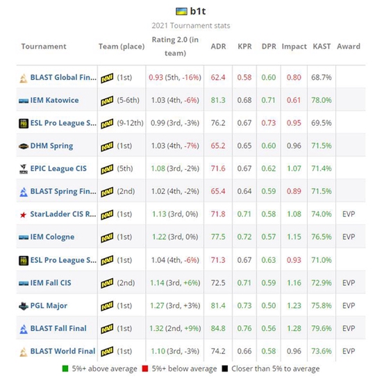 不久之后NaVi再次迎来线下赛事BLAT Premier秋季总决赛,他们有望以不败战绩顺利结束今年的线下赛之旅。在哥本哈根的舞台上,b1t在十张地图上的rating从未亮红,再次帮助NaVi举起了另一座冠军奖杯,b1t在该赛事上成功收获本年度个人的最佳数据,他以1.32rating的优秀表现在排行榜上位列第三名——仅次于s1mple(1.39)和Mathieu “ZywOo” Herbaut(1.36)。虽然在之后的BLAST世界总决赛上b1t有两张地图的表现不佳,但他仍然是队内的稳定核心之一,b1t在该赛事取得1.10rating,帮助NaVi连续第四次捧起了线下赛事奖杯,为2021年画上句号。