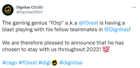 Team Dignitas 电竞俱乐部宣布与 CS:GO 分部选手 f0rest 延长合作,瑞典人的新合同有效期至2022年底。