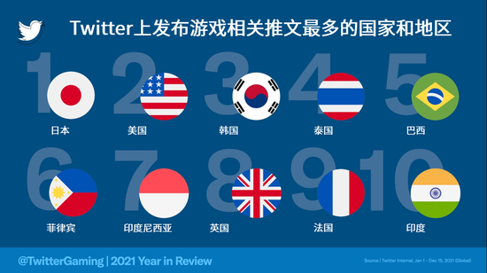 2021年,游戏依然以高速增长而备受关注。根据Newzoo发布的《2021年全球游戏市场报告》,2021年,全球游戏玩家数量同比增加5.4%,总数更是上升至近30亿人。随着越来越多的人开始进入游戏世界,与之相关的讨论量也在同步增长。在刚刚过去的一年中,Twitter上游戏相关的对话达到了24亿条,相较去年有14%的增长,中国米哈游出品的《原神》更是一跃成为2021年在Twitter上讨论热度最高的游戏。更值得关注的是,“电子竞技”(以下简称“电竞”)也成为了在世界范围内最受关注的话题之一。