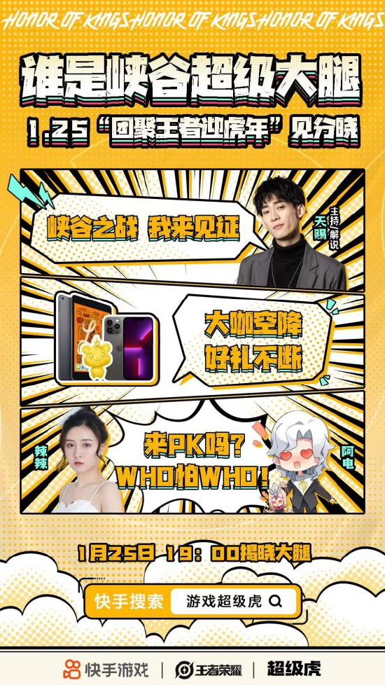2022年1月25日晚7点,登陆快手平台,搜索“王者超级虎”,iPhone13、虎年金条、皮肤道具送不停!!