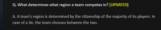 首先是一项引起争议的新规被放出:“一支队伍的区域所属由该队伍大多数选手的国籍决定。”要知道在以往,各地的战队都可以自由选择自己参加的赛区,例如几支巴西战队以及澳洲队伍EXTREMUM就是北美赛区的常客。