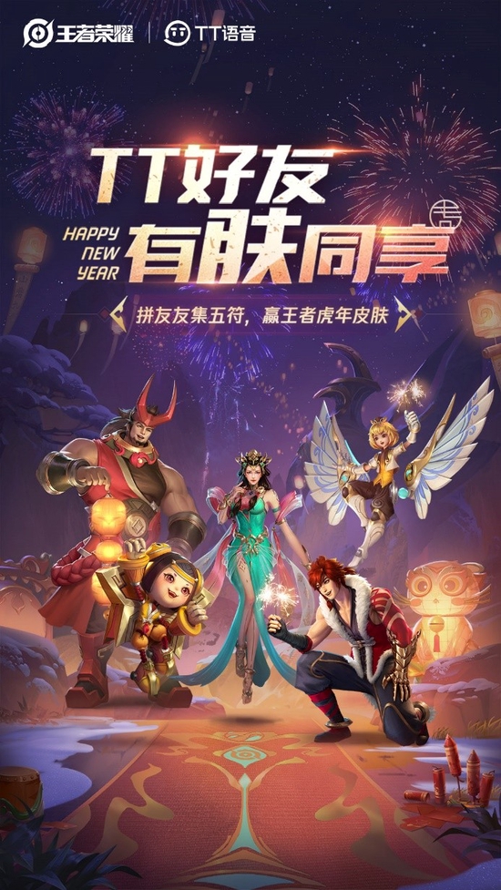 1月25日,TT语音携手王者荣耀,开启“TT好友,有肤同享”虎年新春活动。从1月25日到2月13日,通过TT友友符集卡的形式,和好友一起互相送符集符,即可领取王者荣耀虎年限定皮肤、TT语音周边等多重福利,为Z世代提供线上过年新玩法。