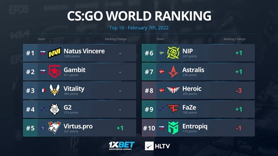HLTV的每周排名照常更新,本周PGL斯德哥尔摩的成绩不再作为积分要素之后前10略微有些变化。前四名依旧是NaVi、Gambit、Vitality和G2,但是Heroic掉出前五。在以1-3名的成绩打完BLAST Premier春季小组赛后,FaZe的排名来到了第九。