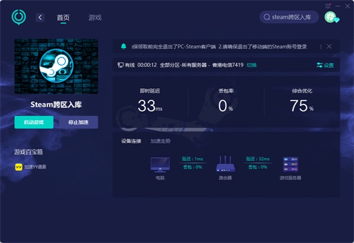 第三步:打开网易UU加速器搜索“跨区”找到“steam跨区入库”点击立即加速。