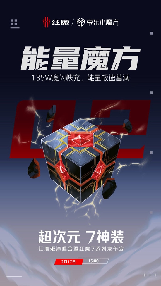 目前红魔7已经是2022年游戏手机品类中最早面市的产品了,从节后开始每天都有官方消息将这款手机一个个“首创”、“首发”的卖点曝光出来,为其2月17日下午3点的发布造势。今天更以 “能量魔方”的七神装主题海报将红魔7搭载全行业首发135W魔闪快充的信息公布出来!这确实吸引了我们注意,要知道红魔在上一代游戏手机产品中已率先应用了行业最快的120W,这次继续刷新上限势必会继续拉动快充方面的行业技术竞争。不少玩家在看到消息后也结合参数推测,红魔7搭载如此高规格的行业顶级快充,预计仅需15分钟就能实现电量从0~100%的满血复活。此外官方还直接爆光了红魔7系列真机背部特写,可以看出其依然延续了大受好评的氘锋透明设计,这个行业独一份的透明ID设计一直在玩家群体中拥有极高人气。