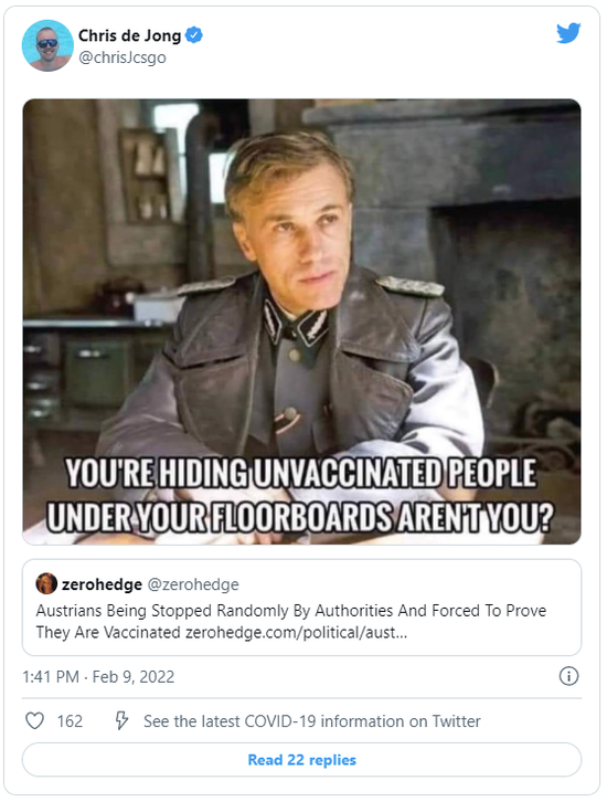 这一消息被公布之后,前MOUZ选手ChrisJ在社媒上公开指责PGL这一做法有意将不愿意接受注射疫苗的人群放在对立面上,把不接受接受注射疫苗归类成“错误”的行为,并煞有介事的配上了截取了电影《无耻混蛋》中影片开头德国军官搜查犹太人的图对PGL的这项要求进行讽刺。