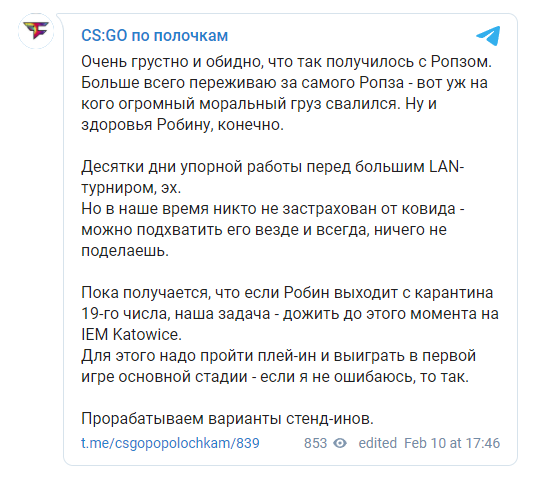 “发生在ropz身上的事令人难过。更重要的是,我担心他本人——他的心理背负着沉重的压力。当然,他的健康也是。”