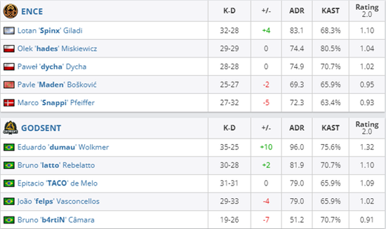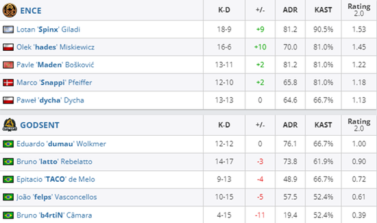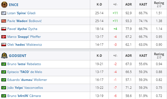 IEM卡托维兹Play-in阶段最后一日,败者组第二轮ENCE与GODSENT鏖战三图,最终以2-1的比分击败对手成功晋级正赛。本场比赛Spinx以75-51 kd与1.32 rating的优秀数据领跑全场,以色列枪男也是ENCE在这场拉锯战中当之无愧的MVP。