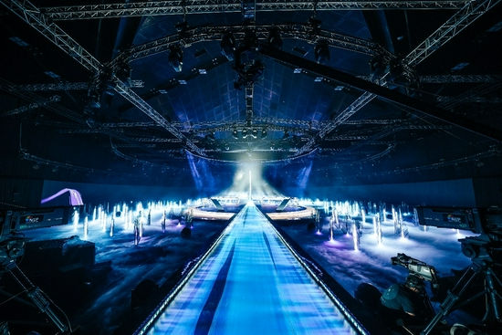 决赛的舞台,一条光桥将圆形舞台分割,紫光蓝光在其间流转,未来感和科技感十足。