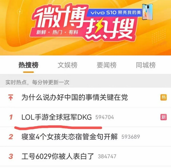 “LOL手游全球冠军DKG”在当晚荣登微博热搜榜第一。破晓杯的相关话题在微博平台的阅读量超过4亿,讨论量近10万。微信指数在当日直接突破两亿,日环比提升872%。