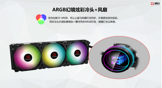 一个好的CPU水冷散热器,除了优异的性能,酷炫的颜值也是必不可少的,骇浪CPU水冷散热器恰好满足了这两点。骇浪散热器的灯效采用了ARGB光效,支持5V ARGB接口,可以利用主板灯控软件同步风扇和冷头的灯效,冷头外部还拓展增加一圈ARGB 光效,增加灯光立体感,让骇浪灯效更加流光炫彩。
