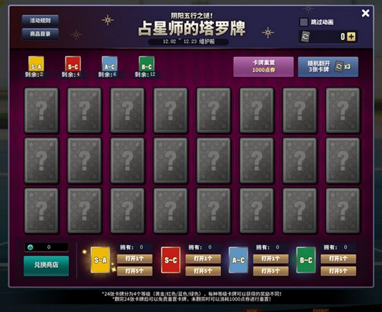 12月2日服务器维护后~12月23日上午7点玩家可以使用[塔罗抽取券]来进行翻牌!一次会出现24张卡牌,分别是黄金:2张/红色:4张/蓝色:6张/绿色:12张。每种卡牌被翻出来的概率都相同。未翻完24张卡片时可以消耗1000点券进行重置。翻完24张卡牌后可以免费进行重置。卡牌重置后可以重新翻24张卡牌。卡牌重置后重新出现的卡牌中每个等级卡牌数量不变。
