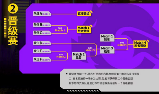 12月11日晋级赛即将打响,积分第一队伍直接晋级,其他队伍将采取五进二淘汰制,总共设有4轮对决,二、三名队伍将以一场BO3比赛,胜者获得第二个晋级名额,败者与剩余3支战队将进行BO3冒泡赛角逐最后一个晋级名额。凭借比赛及任务中的精彩发挥,UFG、KBG、DLG三支战队均以总积分8分的成绩领跑榜首,成为晋级赛直接晋级总决赛资格的有力争夺者,将在晋级赛当日开启焦点之战。此外,SA战队和SVG战队的实力同样不容小觑。