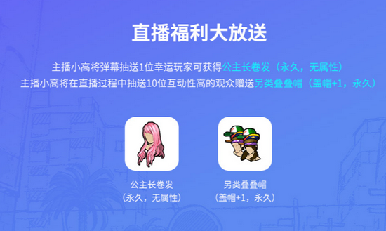 直播过程中也会送出相应的奖励,小高将会通过弹幕抽取一位幸运玩家获得公主长卷发,还会选出10位互动性高的观众送出另类叠叠帽,永久盖帽+1。