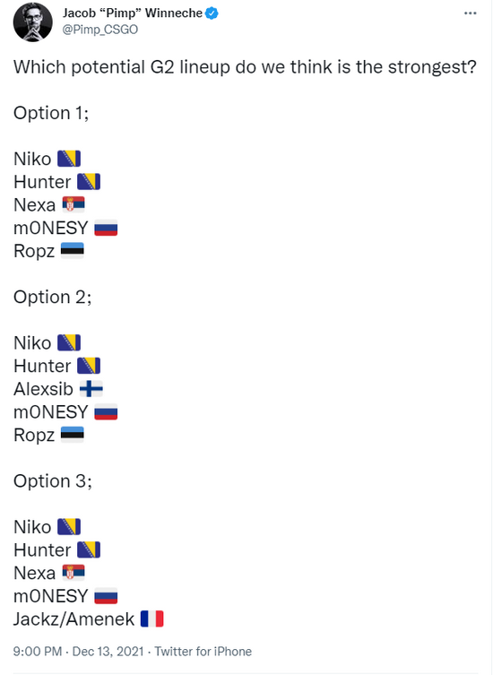 近期,有关m0NESY、Alexsib和ropz与G2产生联系的消息不绝于耳,G2变阵的话题也成为热点。分析师Pimp在他的推特上列举了三种G2的潜在阵容搭配: