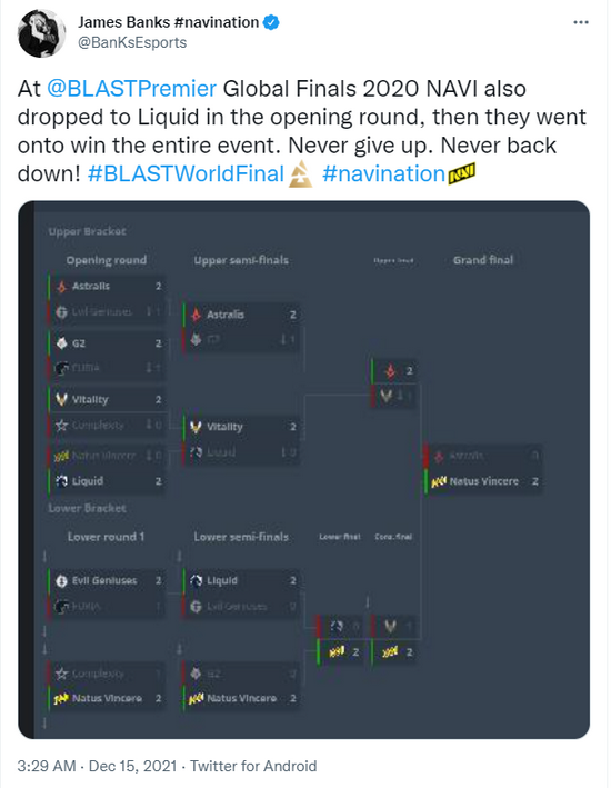 我们知道,BLAST的前线记者Banks与s1mple的交情甚好。在Major夺冠后,s1mple直接把他使用的冠军鼠标送给了Banks作为纪念(也是对他的安慰,因为Major期间Banks的家庭出现了变故)。此次NaVi爆冷输给Liquid后,Banks以2020年的BLAST全球总决赛的经历为依据,对NaVi众将予以了鼓励: