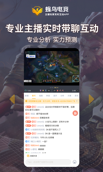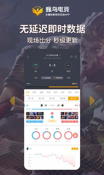 蜂鸟电竞APP(www.fnscore.cn)拥有专业主播与玩家实时带聊互动,提供全球高清电竞直播覆盖,无延迟现场级电竞比分网、即时对局数据、专家电竞方案分析推荐、电竞比赛赛程资讯等。涵盖英雄联盟LOL、刀塔DOTA2、王者荣耀、CSGO等多款热门游戏,助您更好地收看电竞新赛季!