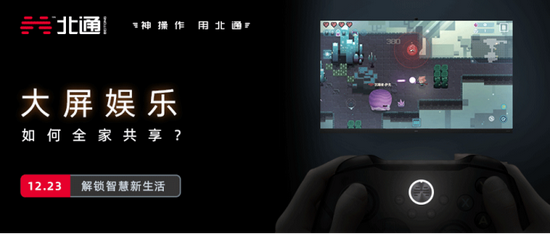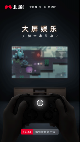 本次放出的一横一竖宣传海报所透露的信息并不多,比较有辨识度的无非是一个疑似《比特小队》的游戏画面和一个中央按键发光的游戏手柄产品。不过在文案方面北通专门提及了“大屏娱乐”,比特小队是一款可以在智能电视云游戏上玩到的游戏作品,这次北通的手柄新品很可能会是和智能电视强相关的产品。