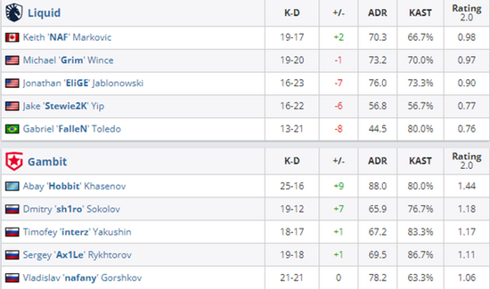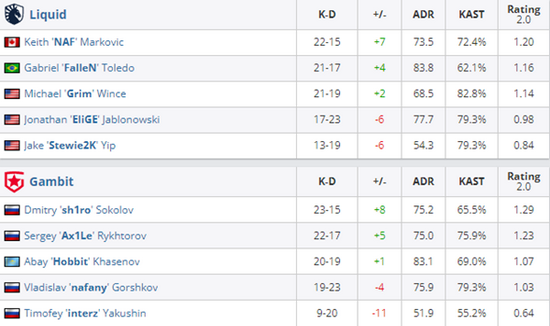 下半场拿下手枪局的Liquid又拿下对方半起局。第三局仅仅只有一把车王的Gambit却险些完成翻盘,最终NAF五杀完成了残局。长枪局Hobbit依靠两颗斜坡单向烟将Liquid玩的团团转,三杀拿下一分顺带击溃Liquid经济,次轮半起成功吃下,比分再度追平。但Liquid一波eco再次将Gambit逐个击破,经济崩盘的Gambit只得放弃赛点。Liquid拿下赛点后不骄不躁,把握机会在A区阵地战中又一次取得优势,3打2的残局3人集体不漏让Gambit无计可施,最终输下图二。