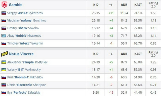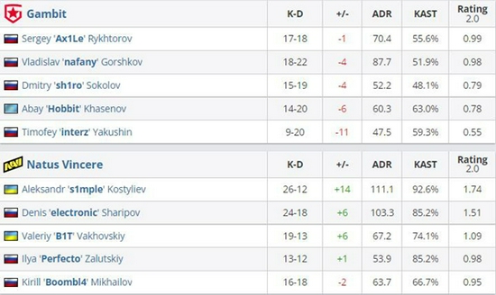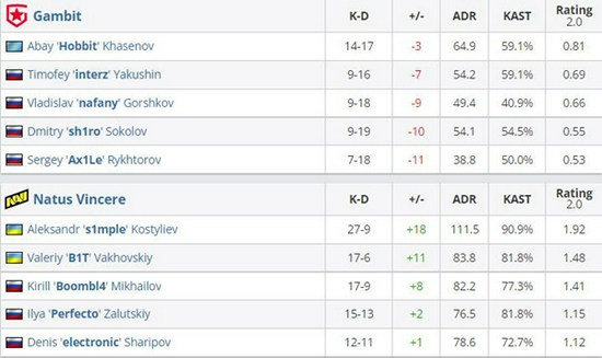 然而在关键局中B1T在残局阶段的优异表现还是帮助NaVi渡过难关,Gambit经济崩盘只得让出赛点,最终s1mple与electronic合砍五杀终结图二,比分16-11。