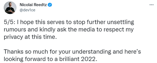 “我希望今天的声明有助于停止这些让人不安的谣言,这些媒体们我也恳求你们尊重我的隐私。非常感谢您的理解,我期待2022年再创辉煌。”