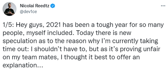 “大家好,2021年对很多人来说都是艰难的一年,包括我自己。今天,关于我为什么这段时间休息又有新的猜测了。我本来不应该站出来说这些,但事实是这对我的队友不公平,我现在必须站出来给一些解释。”