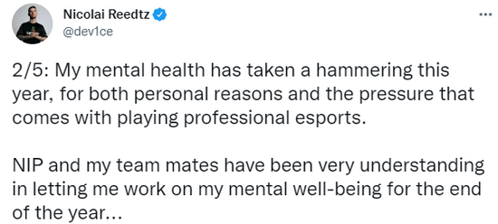 “由于个人原因和职业电子竞技带来的压力,我今年的心理健康出了大问题。NIP和我的队友们非常理解我,并让我在年末花时间去修复自己的心态问题。”