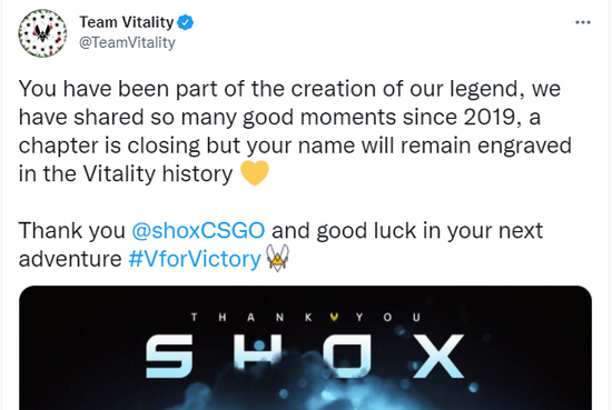 在官推中,Vitality表示:“你创造了我们的传奇中不可分割的一部分,2019年至今我们一同分享无数美妙时刻。虽然这一章已经完结,但你的名字将永远镌刻在Vitality的历史丰碑上。”