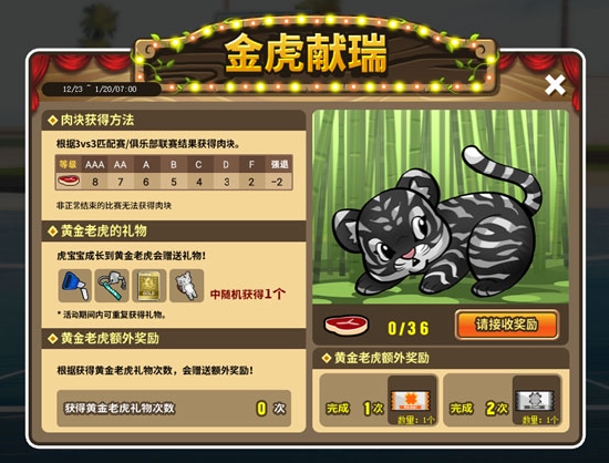 根据匹配赛/俱乐部联赛的结算结果获得“肉块”。虎宝宝成长到黄金老虎会赠送礼物。