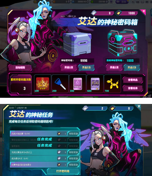 通过进行比赛和完成任务获得密码箱钥匙!使用“神秘密码箱钥匙”打开神秘密码箱获得各种道具。