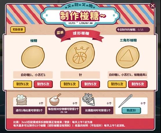 玩家通过活动累计材料制作“椪糖”。制作不同的椪糖可以获得道具奖励。比赛:正常结算的3V3匹配赛或俱乐部联赛。每日最多可以制作15个椪糖。