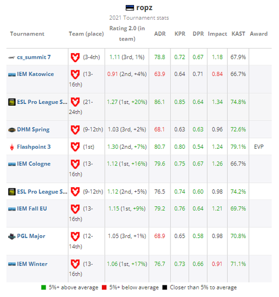 ropz 在整个 2021 年的所有选手中拥有一些最令人印象深刻的数据:第七高的Rating(1.17)、顶级赛事中最出色的击杀手(0.77 KPR,世界第四)、非常稳定的发挥(72%地图的评分高于1.00,世界第九)。与前几年相比,他的影响评分也逐渐增高(1.18,世界第11),这也归功于他的首杀率(局均 0.13,世界第十四)以及多杀率(19.9%,世界第四)。这些数据足以让他等上TOP 20榜单,但在大型赛事中的缺乏成绩让他难以更进一步。