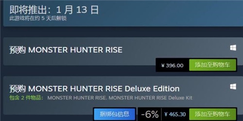 本次steam发售一共有两个版本可供大家选择,其中普通版售价为396元只包括游戏本体,豪华版售价465.3,还另外附赠了猎人外观、随从外观、动作、发型和脸部彩绘等。值得一提的是,这些装备和道具无法直接购买,想要获取只能通过购买豪华版游戏,如果是怪猎系列粉丝,可以考虑入手。