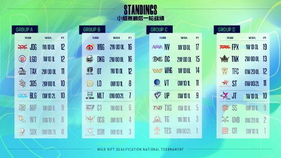 自12月26日正式开打以来,英雄联盟手游职业资格赛·全国大赛赛道历经12天小组积分赛的角逐, 32支战队中已经正式决出16强战队。其中JDG、WBG、NV、FPX均以小组积分第一的身份进入淘汰赛,此前被寄予厚望的破晓杯冠军DKG尽管首局落败于WBG,随后发力打出与WBG一样的成绩,不辜负粉丝们的期待以小组第二出线。