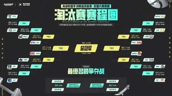 值得注意的是,本次淘汰赛中16强队伍将会分为两个半区进行争夺,半决赛之前将会采用BO5赛制,进入半决赛后则调整至BO7赛制。整个淘汰赛全部结束后,全国大赛赛道总冠军,6个英雄联盟手游一级职业联赛资格以及11个英雄联盟手游二级职业联赛资格(第7至17名)也将全部出炉。