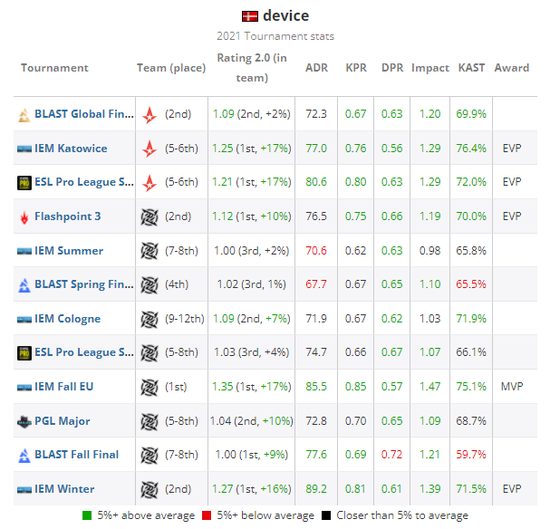 Device的2021年悄然开始,第一场赛事BLAST全球总决赛上他获得了一个VP提名,当时Astralis输给了Natus Vincere,而后者已经在当时初现贯穿一整年的强大实力,整个赛事丹麦狙击手以1.09的Rating和1.20影响力评分结束,但在之后的BLAST Premier春季小组赛上,丹麦队伍在输给 NIP 和 BIG 后以 7-9 名的成绩苦苦挣扎,而device的数据甚至拿到了更高的1.10的Rating和1.26影响力评分。
