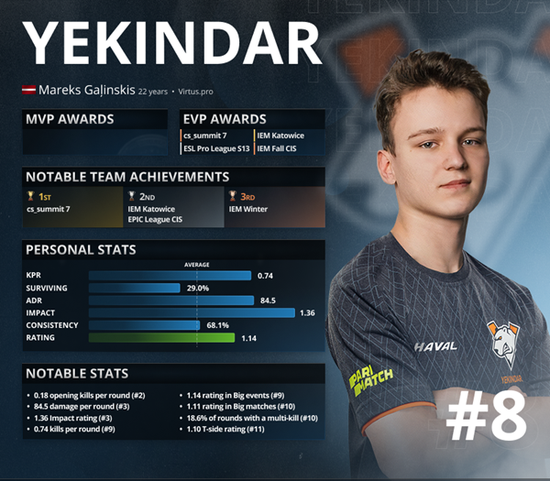 Mareks “YEKINDAR” Gaļinskis首次出现在Top20榜单之中,并被评选为本年度的Top 8选手,他那高额的impact数据与极为恐怖的突破能力是他上榜的理由。