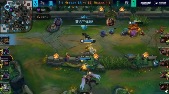 回顾整场比赛,第一局双方在前期打的有来有回,OT战队在小龙的争夺中先拔头筹取得优势,但奈何305战队中后期凭借中路irma阿狸与射手Jack拉克丝的巨额输出伤害,完成翻盘先下一城。而第二局开始OT战队似乎找到了破解305战队的团战秘诀,全员通过反击配合,迅速扳回一城。OT战队“反击”成功后,305战队从第三局开始采用了更加激进的开团策略,不断通过进攻大龙逼迫对方参团,让OT战队在团战中不断减员,频频出现一换三,零换四的局面,最终扭转局势的305战队连续取得两局胜利,OT战队再输一局就将无缘一级职业联赛资格。