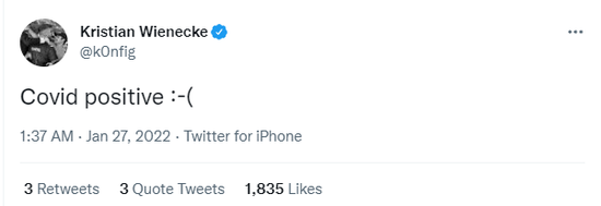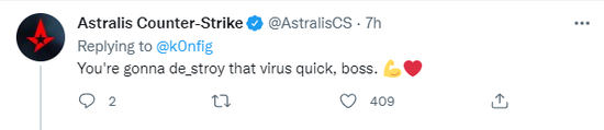 Astralis选手k0nfig今天凌晨在自己的推特上确认,他在COVID-19的测试中呈阳性。