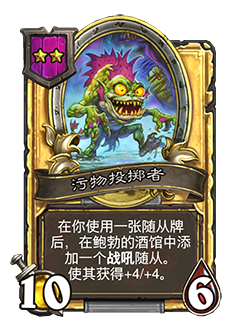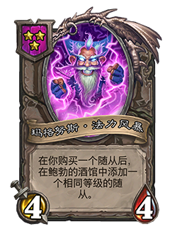 ——[金色版本]旧:在你使用一张随从牌后,随机在鲍勃的酒馆中添加两个战吼随从。→ 新:在你使用一张随从牌后,随机在鲍勃的酒馆中添加一个战吼随从,使其获得+4/+4。