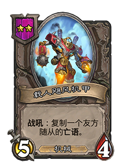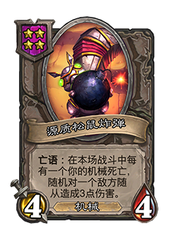 ——旧:亡语:对一个敌方随从造成4点伤害。在本场战斗中每有一个你的机械死亡,重复一次。→ 新:亡语:在本场战斗中每有一个你的机械死亡,随机对一个敌方随从造成3点伤害。
