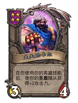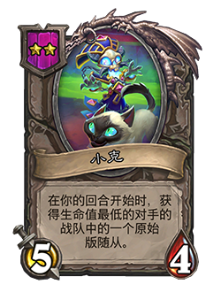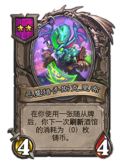 ——旧:使你手牌中法力值消耗大于或等于(4)点的中立随从牌的法力值消耗减少(2)点。→ 新:使你手牌中法力值消耗大于或等于(4)点的两张中立随从牌的法力值消耗减少(2)点。