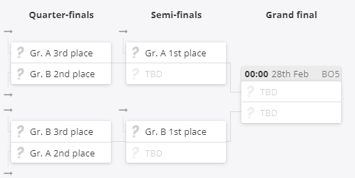 赛制:全程采取BO3双败淘汰赛制,分为2个小组,每个小组8支队伍。每个小组的前三名将进入淘汰赛。小组第一直接进入半决赛,小组二、三名进入四分之一决赛。