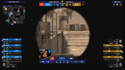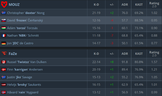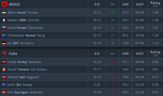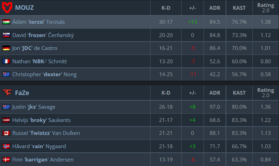 下半场手枪局FaZe的外场夹A被MOUZ枪法化解,强起的FaZe再次夹A,同样的剧情上演,MOUZ再次凭借火热的枪感将比分拉到了11-6。又一次的沙鹰夹A却在jks的三杀下出其不意拿下一分,不过转换攻势打铁板的FaZe却被早已非常规布防的MOUZ轻松化解,又轻松收下eco,此时比分13-7。长枪局的FaZe选择外场进攻,但今天的MOUZ全员在线,碾压了FaZe,随后的eco局dexter也四杀发挥拿到15-7的赛点,最后轻松防住FaZe进攻16-7先下一城。