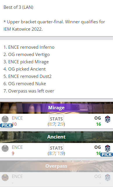 OG 2- 0 ENCE (Mirage 16-10; Ancient 16-9)